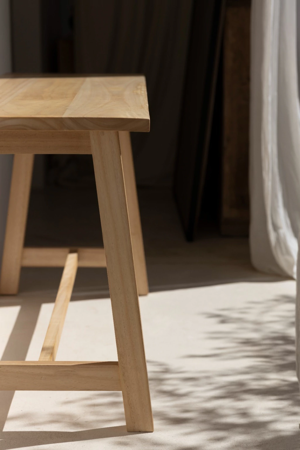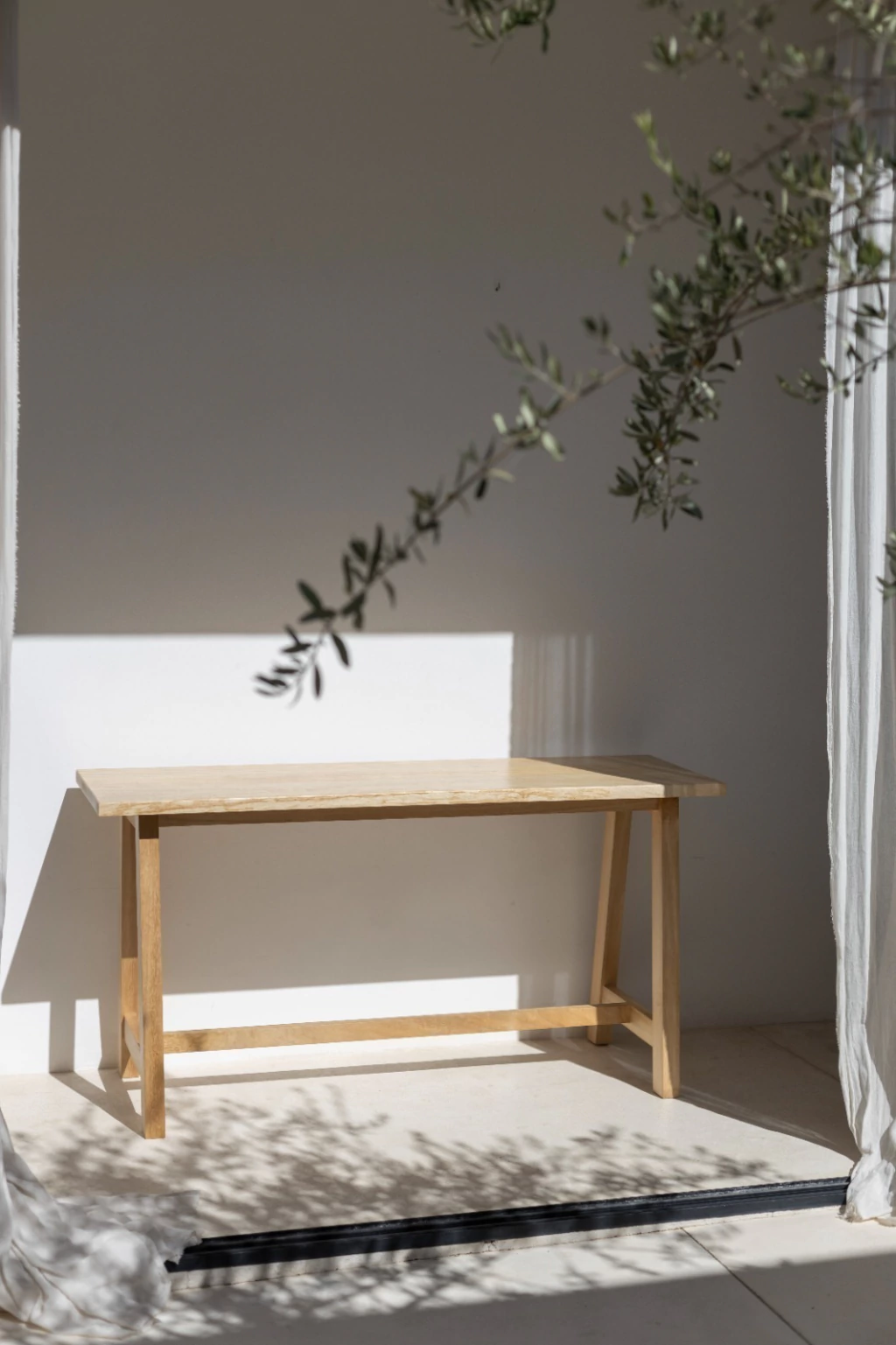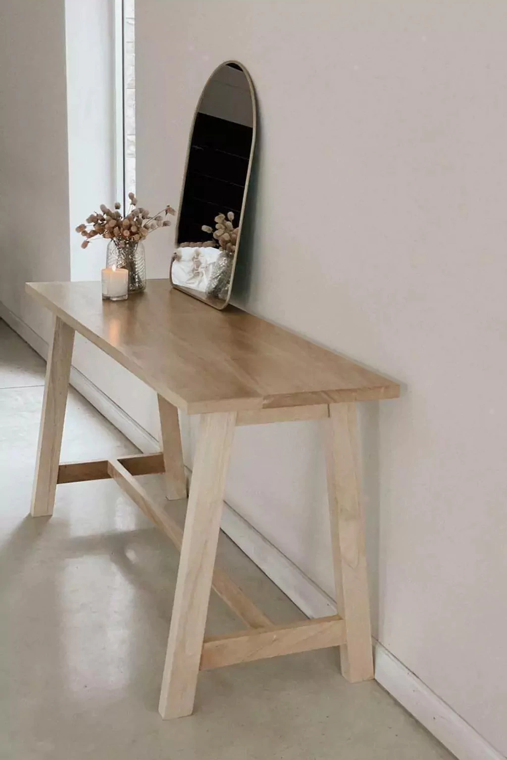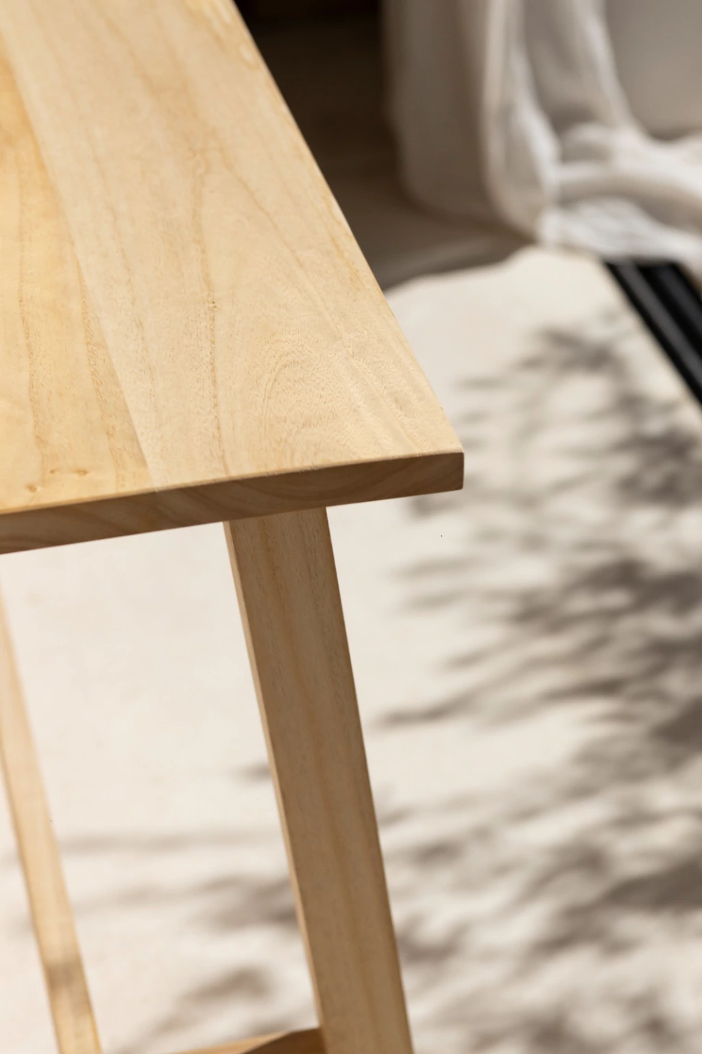 Escritorio de Kiri macizo, con terminación de laca poliuretánica extra mate, también se puede usar como mueble recibidor, de estilo nórdico con estructura de patas tipo A.