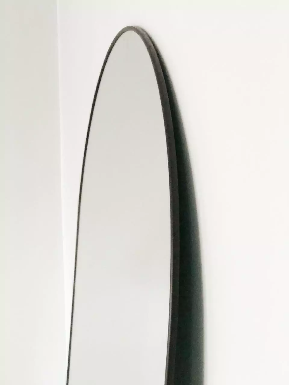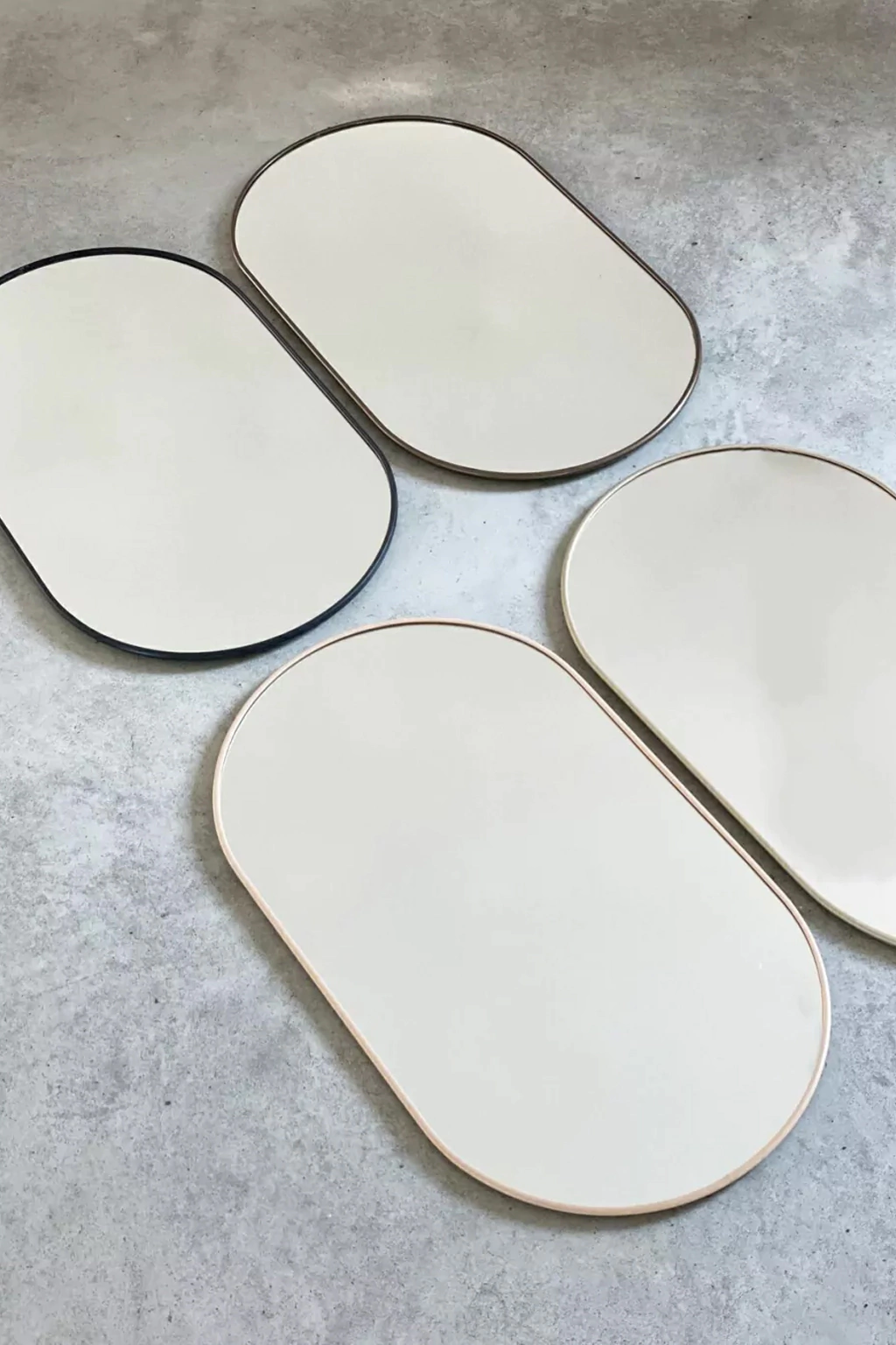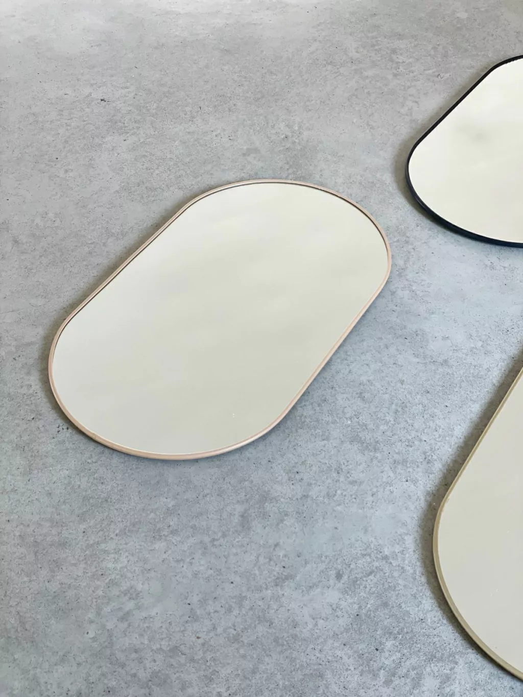 Espejo de pared o de apoyo con forma ovalada con fino marco de PVC, disponible en dorado, negro, beige u ocre.
