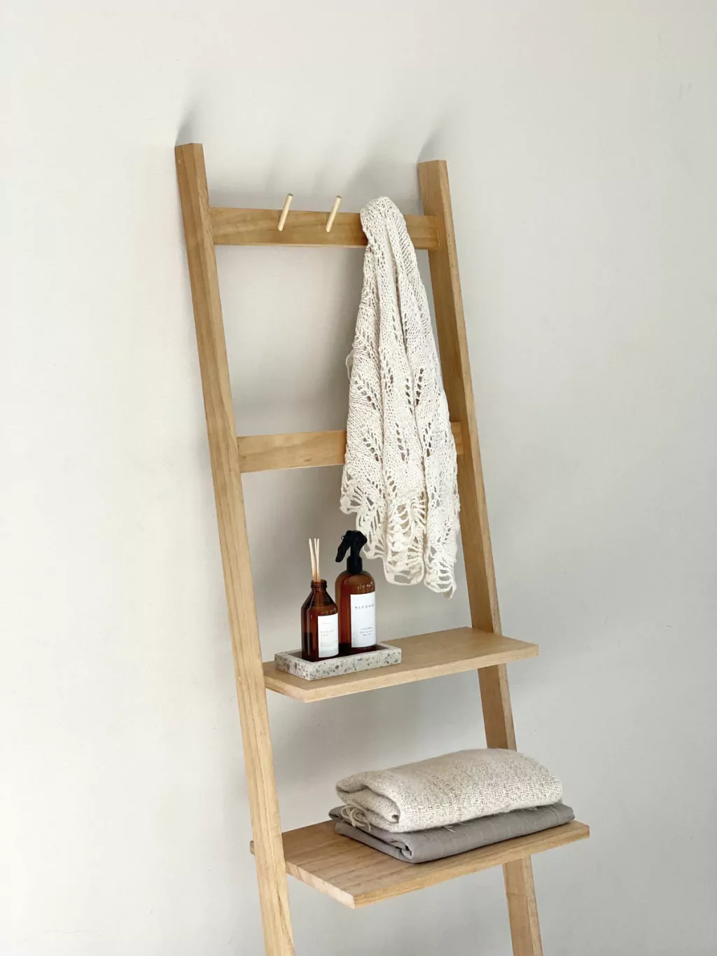 Estantería con perchero, diseñada para apoyar contra la pared. Tiene 3 tiradores en la parte superior y dos estantes.