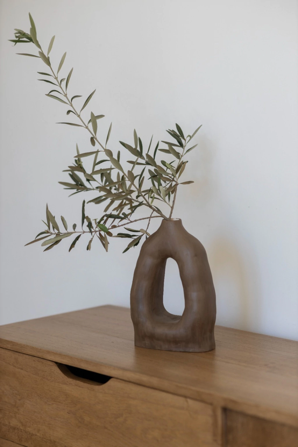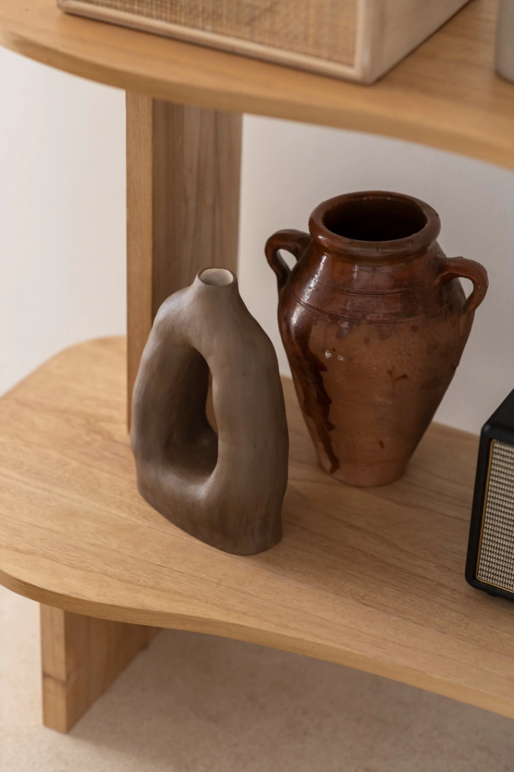 Jarrón de cerámica con forma orgánica y terminación de piedra rústica marron.