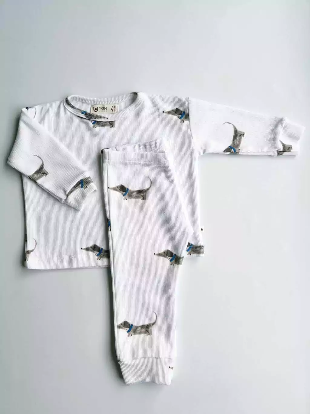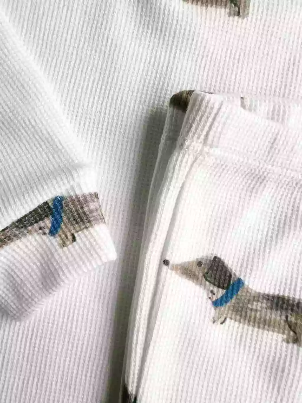 Set de camiseta de cuello redondo con manga larga y pantalón. Acabados en la misma tela. Estampa con tinta al agua.