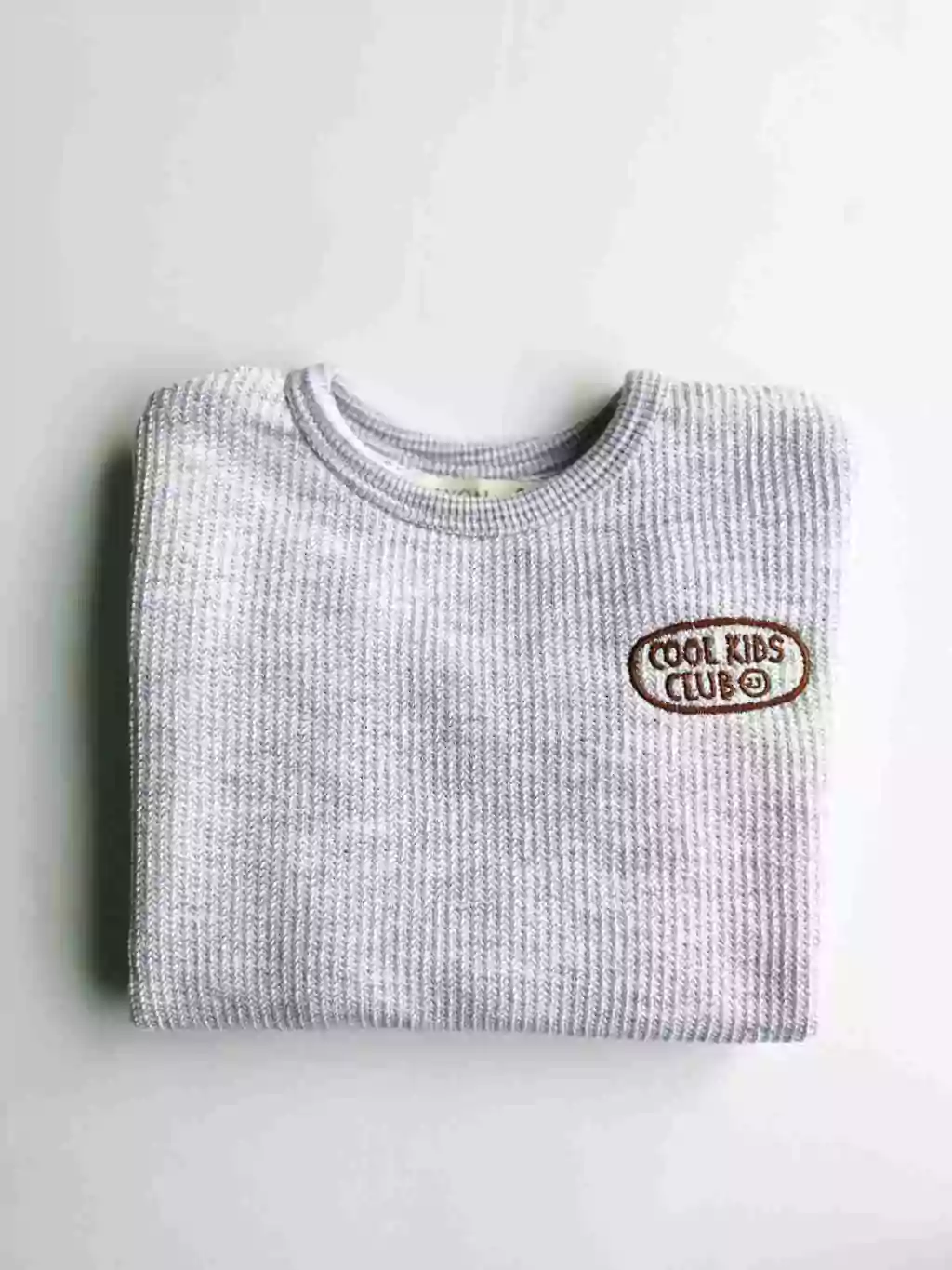Sweater gris corte oversized con cuello redondo y manga larga. Detalle de bordado en color chocolate.
