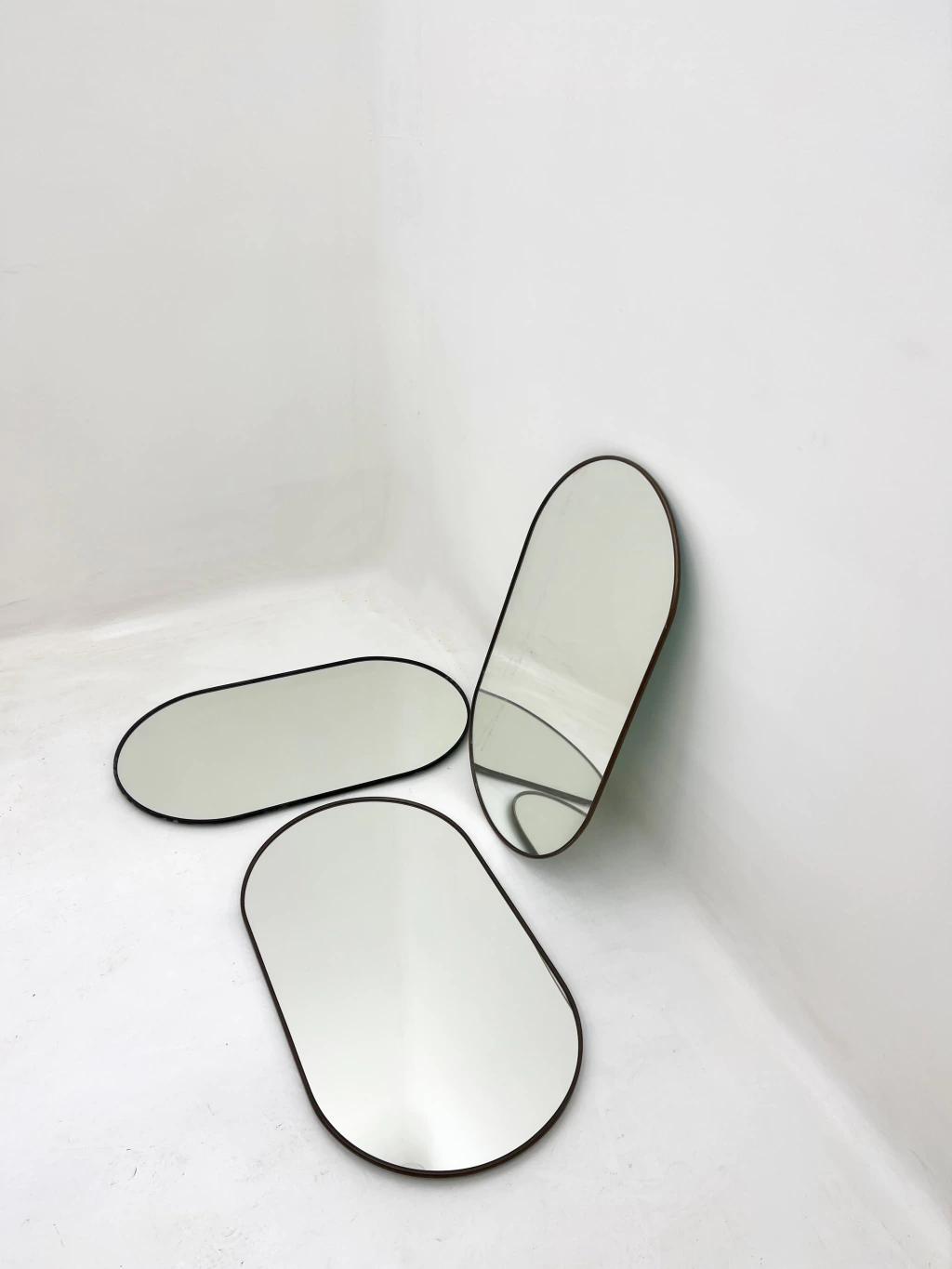 Espejo de pared o de apoyo con forma ovalada con fino marco de PVC, disponible en dorado, negro, beige u ocre.