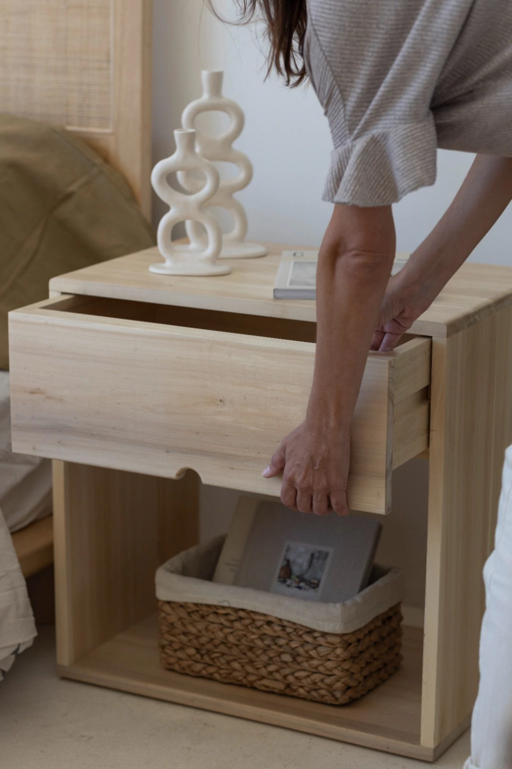 Nuestra Mesa de Luz 011 es de líneas simples y espaciosa, con un cajón súper ámplio sin tirador que suma a su estética minimalista. Podes llevarla en tono natural u oscuro para combinarla como más prefieras. El cajón de esta mesa de luz no cuenta con correderas mecánicas.